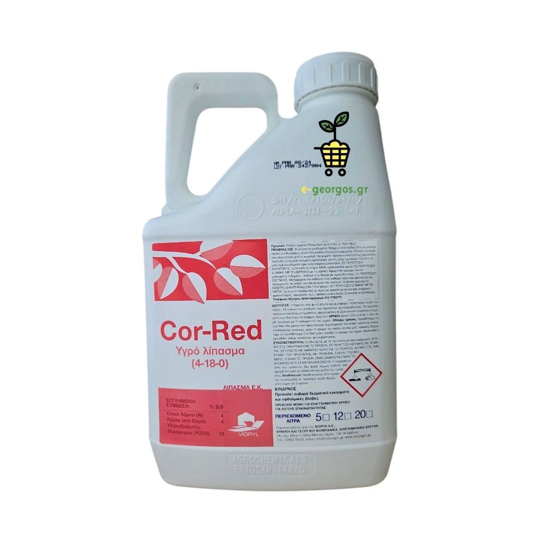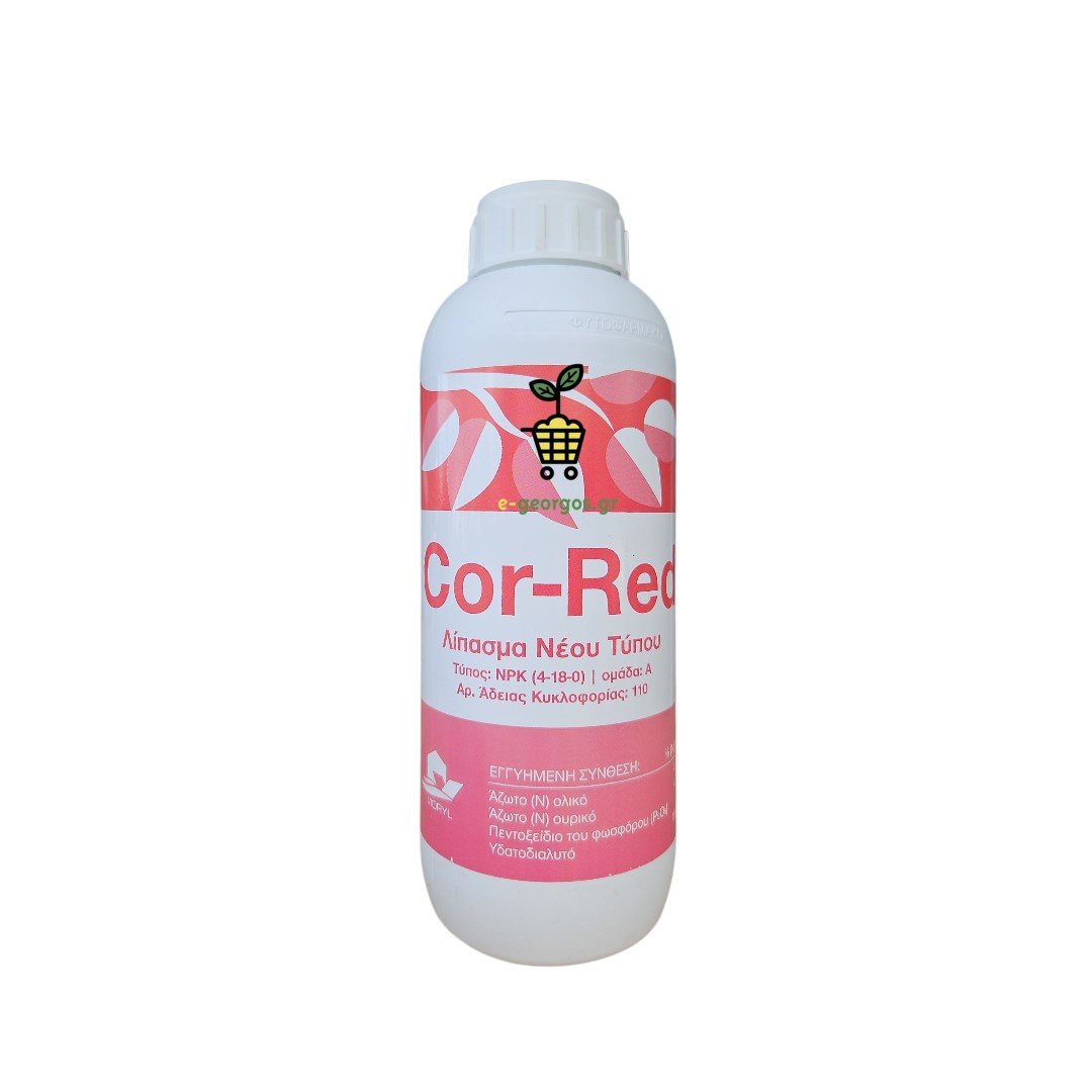 Η σύνθεση του Cor-red είναι 4-18-0 και αποτελεί ένα υγρό λίπασμα που παρέχει στα φυτά το απαραίτητο Άζωτο και Φώσφορο.